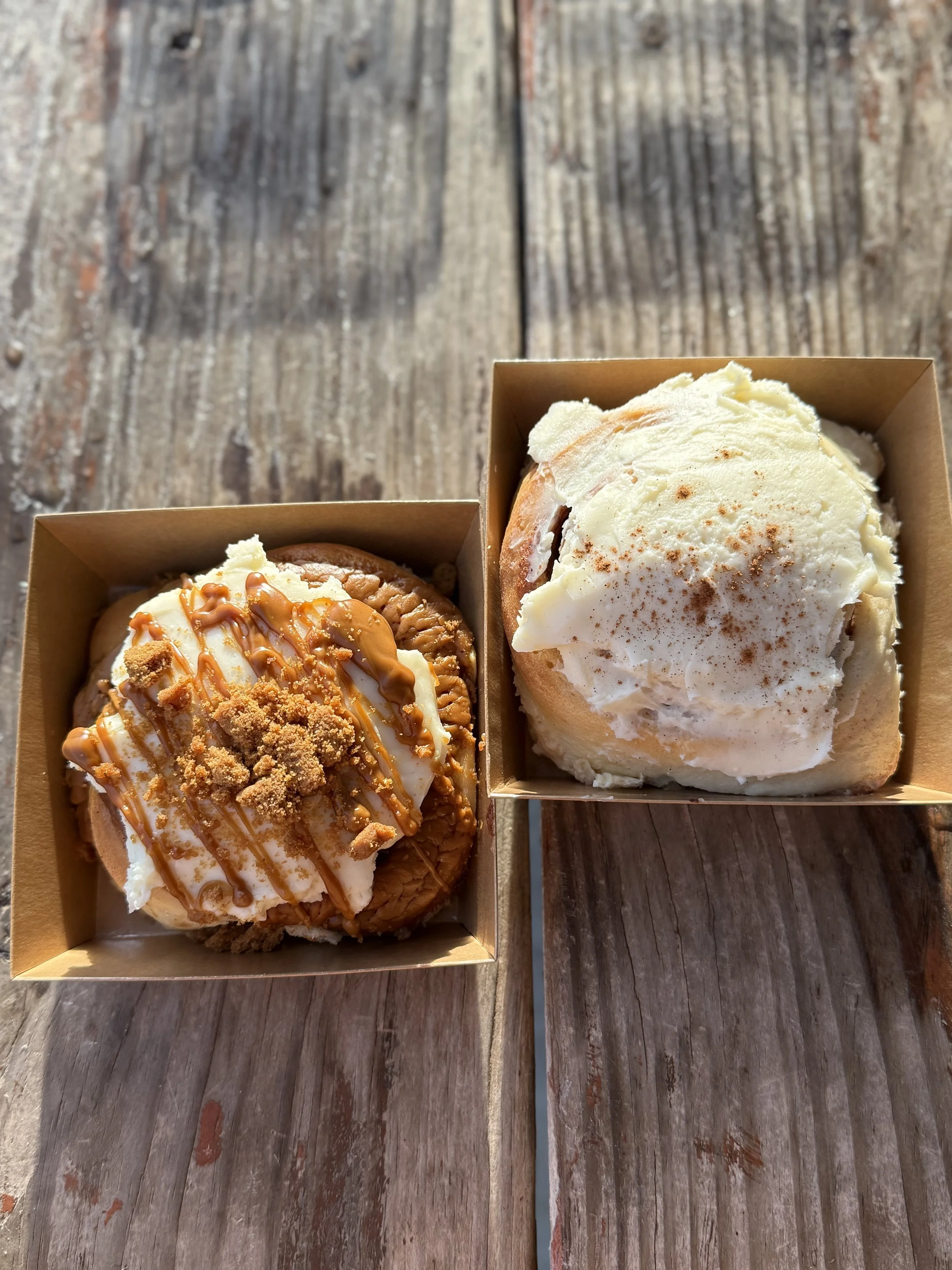 Our cinnys are made with Japanes-style milk bread. That’s a fancy way of saying they are softer, more pillowy, and just the right amount of sweetness. They’re topped with our signature vanilla bean cream cheese icing for the perfect, familiar taste you’re craving.